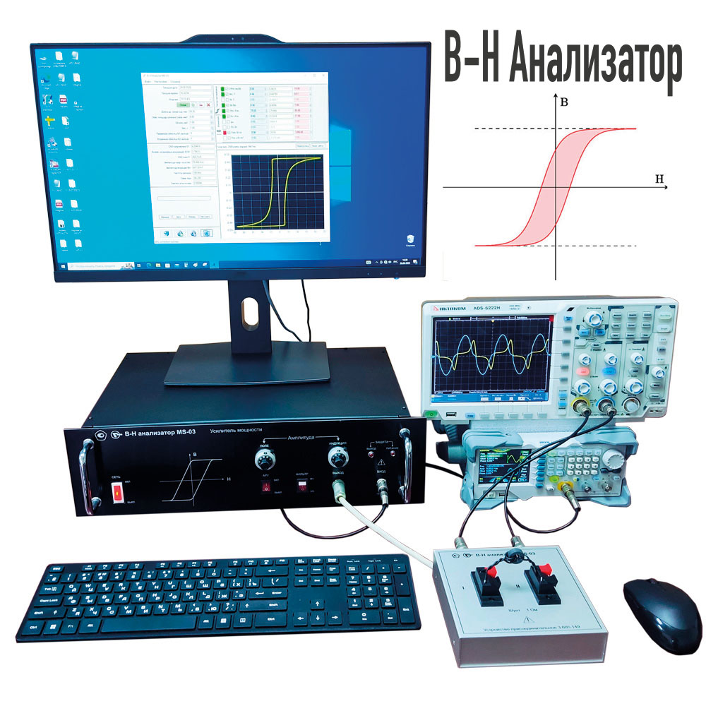 Назначение: Установка магнитоизмерительная «В-Н анализатор MS-03» предназначена для измерения электромагнитных параметров динамической петли гистерезиса магнитопроводов и образцов магнитомягких материалов при частотах от 50 Гц до 1 МГц в исследовательском и производственном (экспресс) режимах.