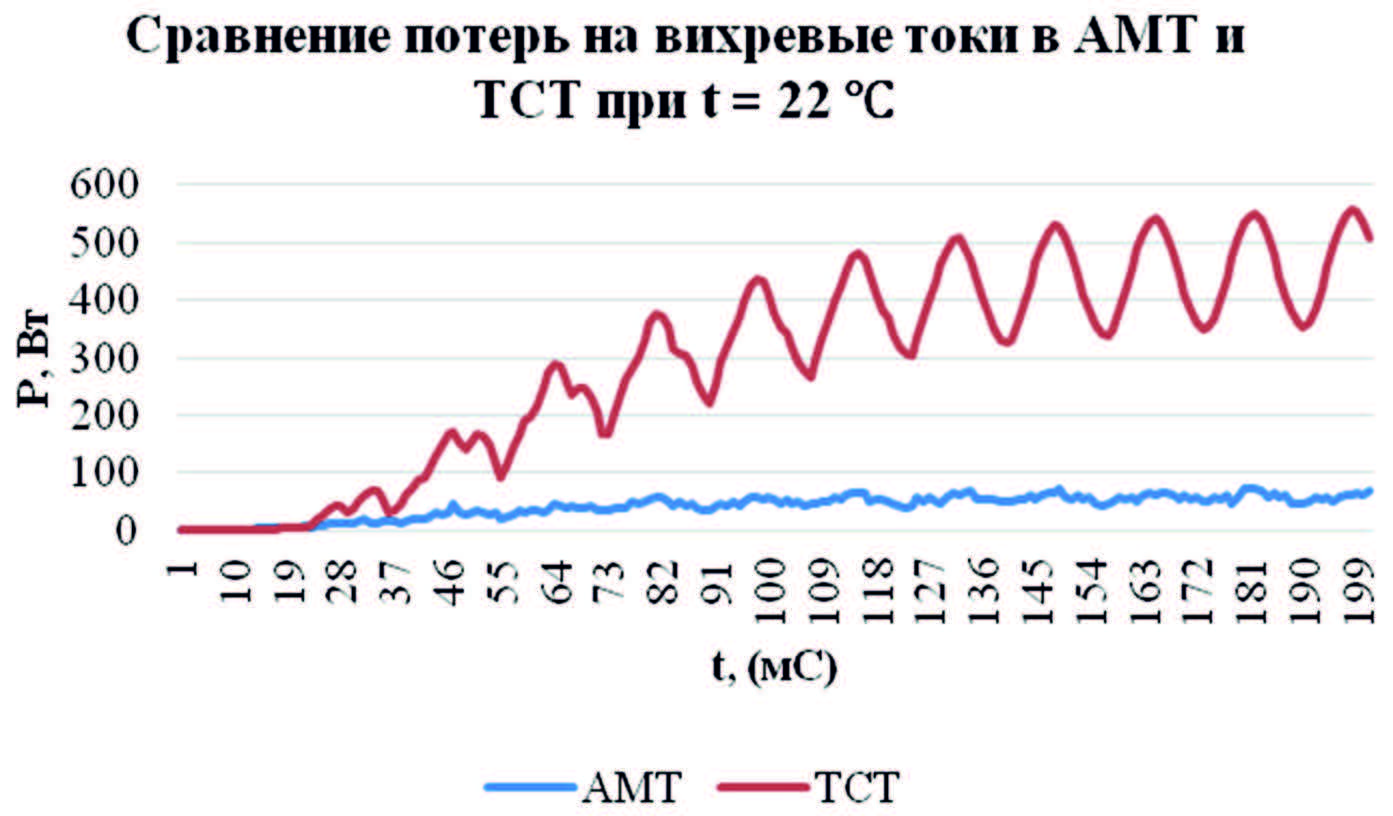 Рис. 4. Сравнение потерь на вихревые токи в АМТ и ТСТ