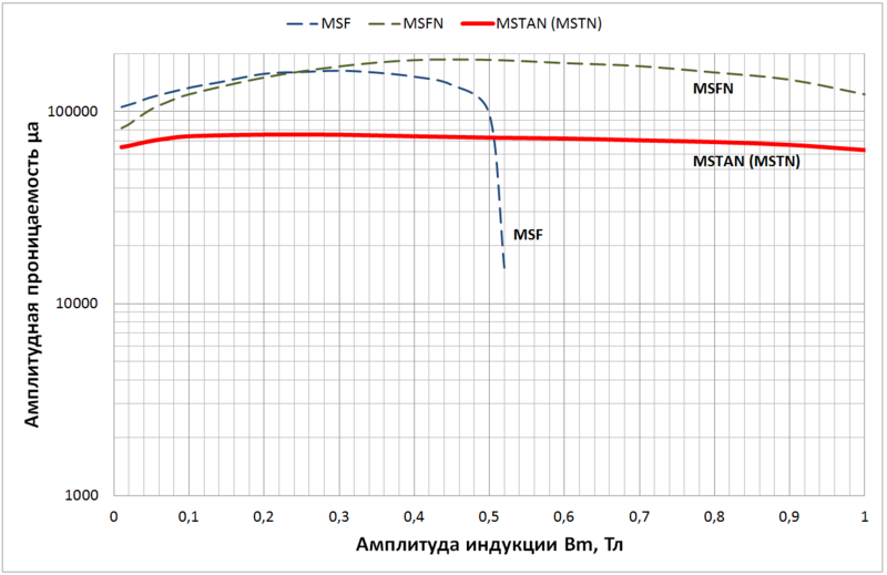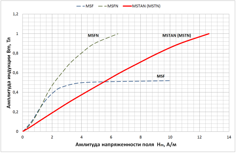 • Хорошая линейность петли гистерезиса обеспечивает слабую зависимость проницаемости от амплитуды индукции, что способствует улучшению качества звука на малой громкости (эффект первого ватта).