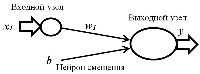 где y – предсказанное (расчетное) значение классифицирующей функции, x1 – значение аргумента функции из обучающей выборки, w1 – весовой коэффициент, b – коэффициент смещения функции (на начальном этапе построения сети равен 0).