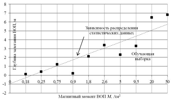 В первом приближении для упрощения задания классифицирующей функции на основе обучающей выборки (табл. 1) возможна классификация по двум параметрам. За значение х1 принимается магнитный момент М, Ам2, за значение y – глубина залегания ВОП в грунте, м. Распределение статистических данных обучающей выборки по ВОП для лучшего представления входных данных показано на рис. 5.