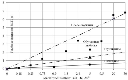 где y – глубина залегания ВОП, м (в данном случае целевое значение, которое может меняться), х1 – магнитный момент М, Ам2, х2 – длина ВОП, м, х3 – пороговое значение магнитного момента М, Ам2, w1, w2, w3 – весовые коэффициенты.