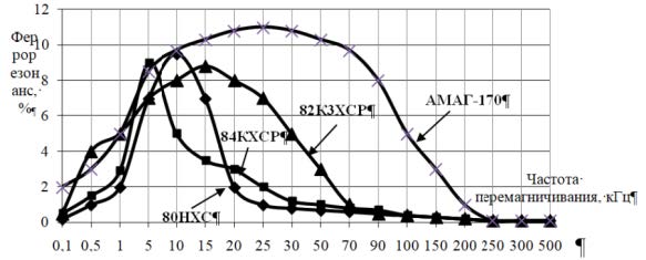 Рис. 9. Экспериментально полученные зависимости величины феррорезонанса от частоты перемагничивания сердечников