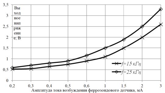Анализ зависимостей, представленных на рис. 11 показывает, что передаточная характеристика разработанной феррозондовой сенсорной системы возрастает при работе на более высокой частоте (f = 25 кГц) возбуждения сердечника.